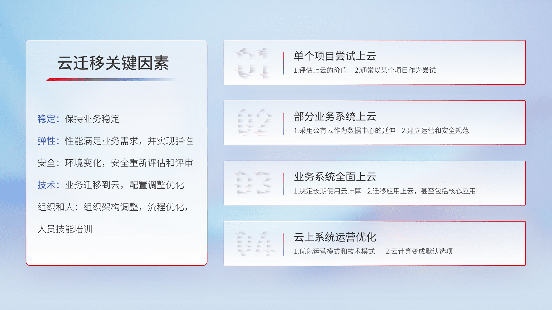 结合实际业务,,从规划设计、、、云平台选型、、云原生改造、、数据迁移、、、集成交付,,,迁移全过程为客户识别最佳上云路径,,做好风险识别管理,,,设计网络架构、、、、身份权限、、安全审计合规、、操作审计、、、、日志审计、、监控告警策略、、、、多站点容灾设计等,,,对云上基础设施进行整体规划,,,,提升IT治理水平,,,以满足弹性、、高可用、、、高性能的需求。。