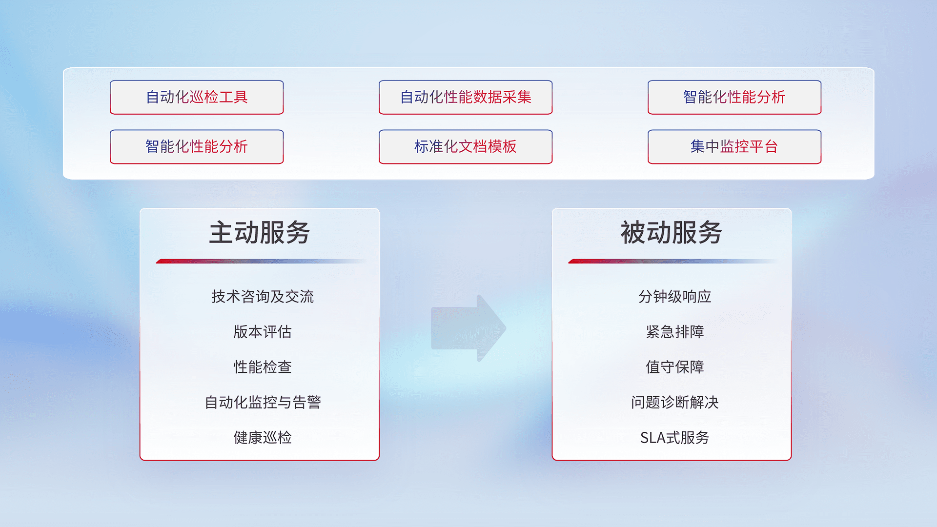 智能化工具和标准化文档,,保障服务质量,,提供主动服务(包含技术咨询、、版本评估、、、性能检查、、自动化监控与告警、、健康巡检)和被动服务包含(分钟级响应、、、、紧急排障、、、值守保障、、问题诊断解决、、、SLA服务)。。。